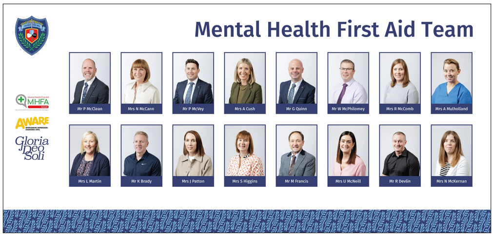 Mental Health First Aid is designed to equip people with the skills and knowledge they need to help someone with a mental health problem or in a mental health crisis. In St. Mary's, we are proud that a large number of staff are fully trained in Mental Health First Aid, a course delivered by AWARE NI, and accredited by the Public Health Authority.